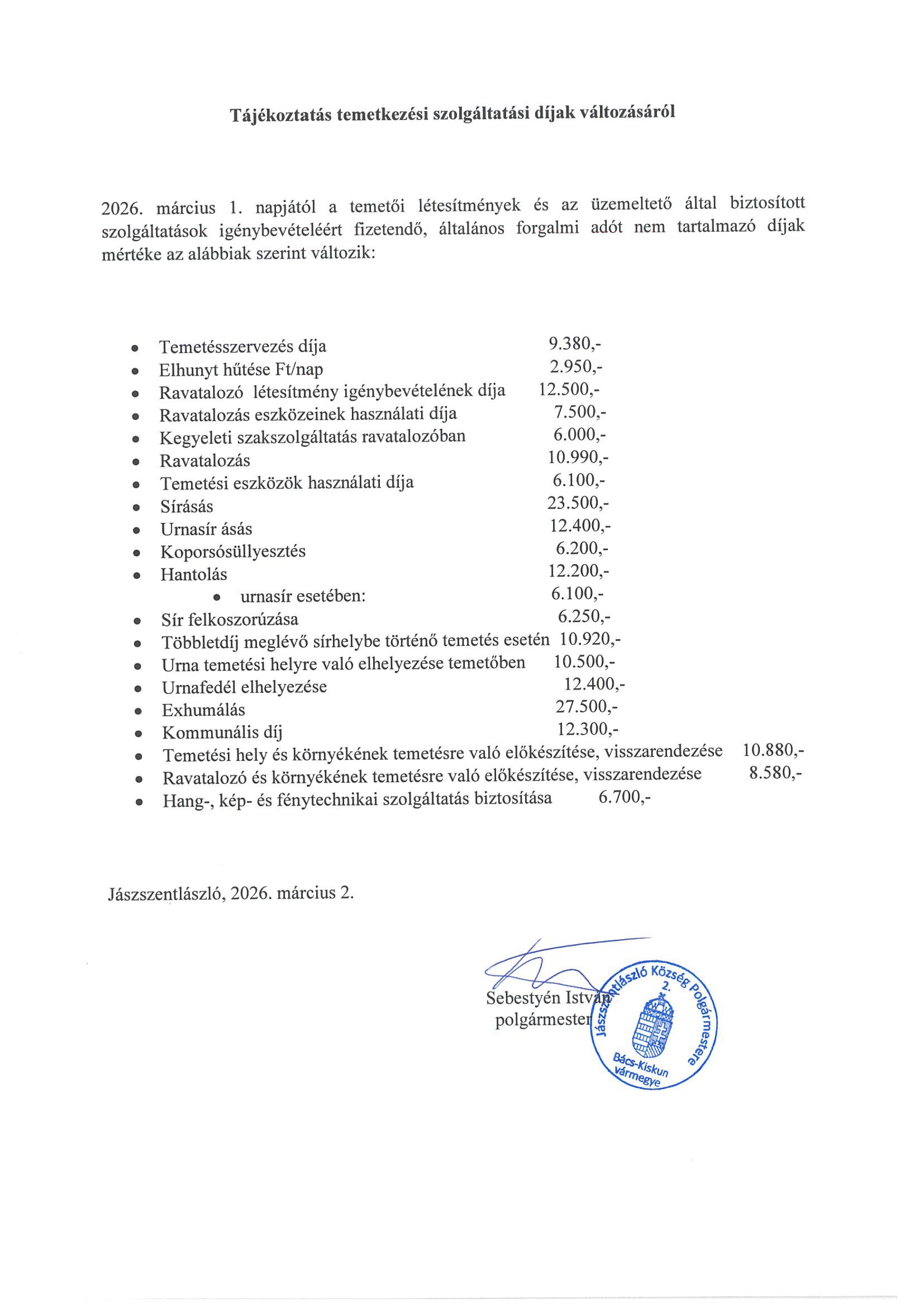 Temetkezési szolgáltatási díjak változása
